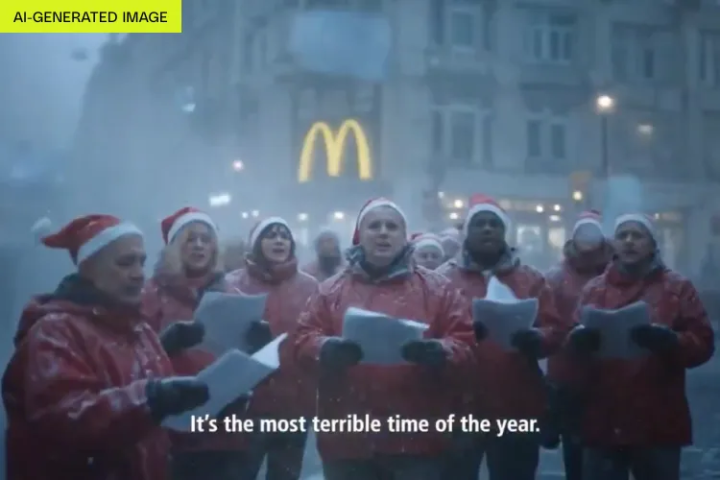 这则广告展示了由AI生成的人物接连遭遇各种冬季烦恼:家庭聚餐、购物、唱圣诞颂歌、烤饼干以及装饰圣诞树,而每项活动都以某种方式出了差错。广告最后建议观众:“躲进麦当劳,一直待到一月到来。”