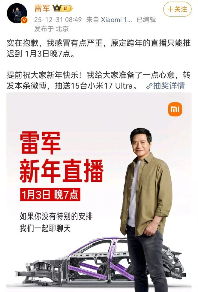 12月31日,小米创办人、董事长兼CEO雷军发文:实在抱歉,我感冒有点严重,原定跨年的直播只能推迟到1月3日晚7点。